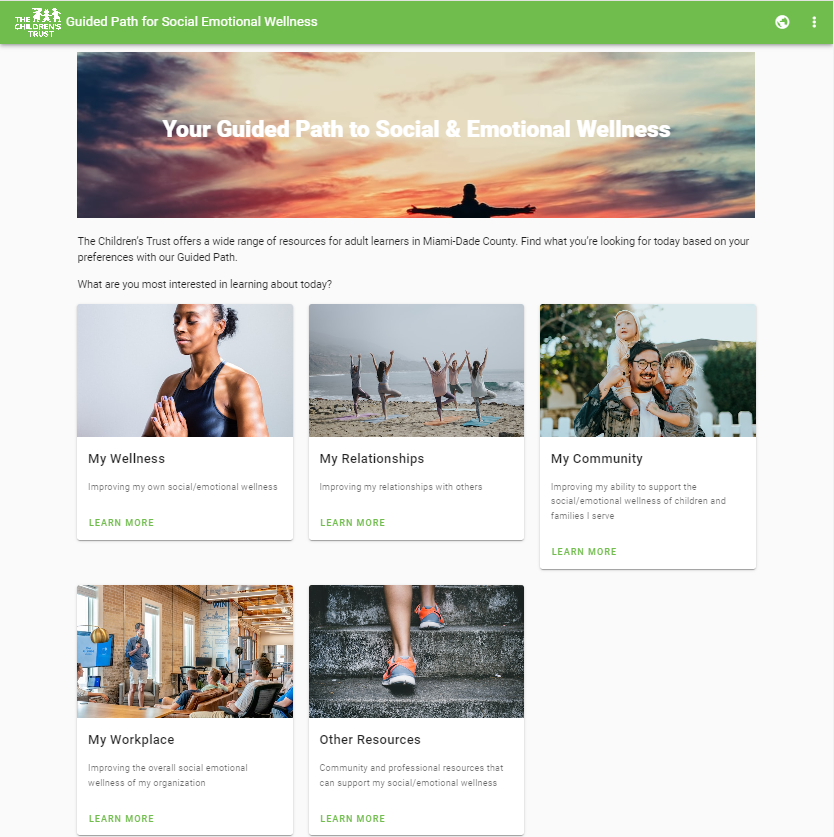 The Guided Path for Social Emotional Wellness was created by the University of Miami for families and providers to more quickly and efficiently find the services in Miami-Dade County that best fits their unique needs. Providers funded by the Children’s Trust are listed with information about their location of services, hours of availability, the specific services they offer (e.g., group parenting, individual treatment, etc.), and the language in which these services are offered. Caregivers can navigate the GPS to find services that may fit their or their child’s needs, including both treatment programs and resources in the community. Providers can also use this resource to help families find the complementary services to support the families they serve. For example, a provider who does individual treatment with a family may use the GPS to help them find a group parenting intervention near them. Lastly, the GPS includes a section for providers to find resources related to improving their own social emotional wellness in the workplace and beyond. Overall, the use of this tool is meant to increase family access to free, high-quality services in Miami-Dade.